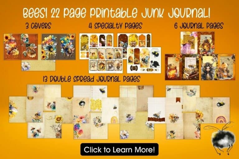 This wicked cool 22 page Bee Junk Journal Kit is perfect if you want to make something beautiful, but don't have the time to gather all the bits and bobs yourself! There are so many beautiful bee images you can use to make gorgeous pages yourself... these are just a few of the pages made