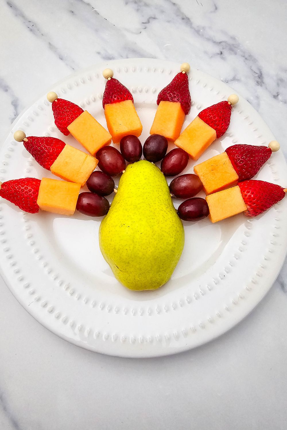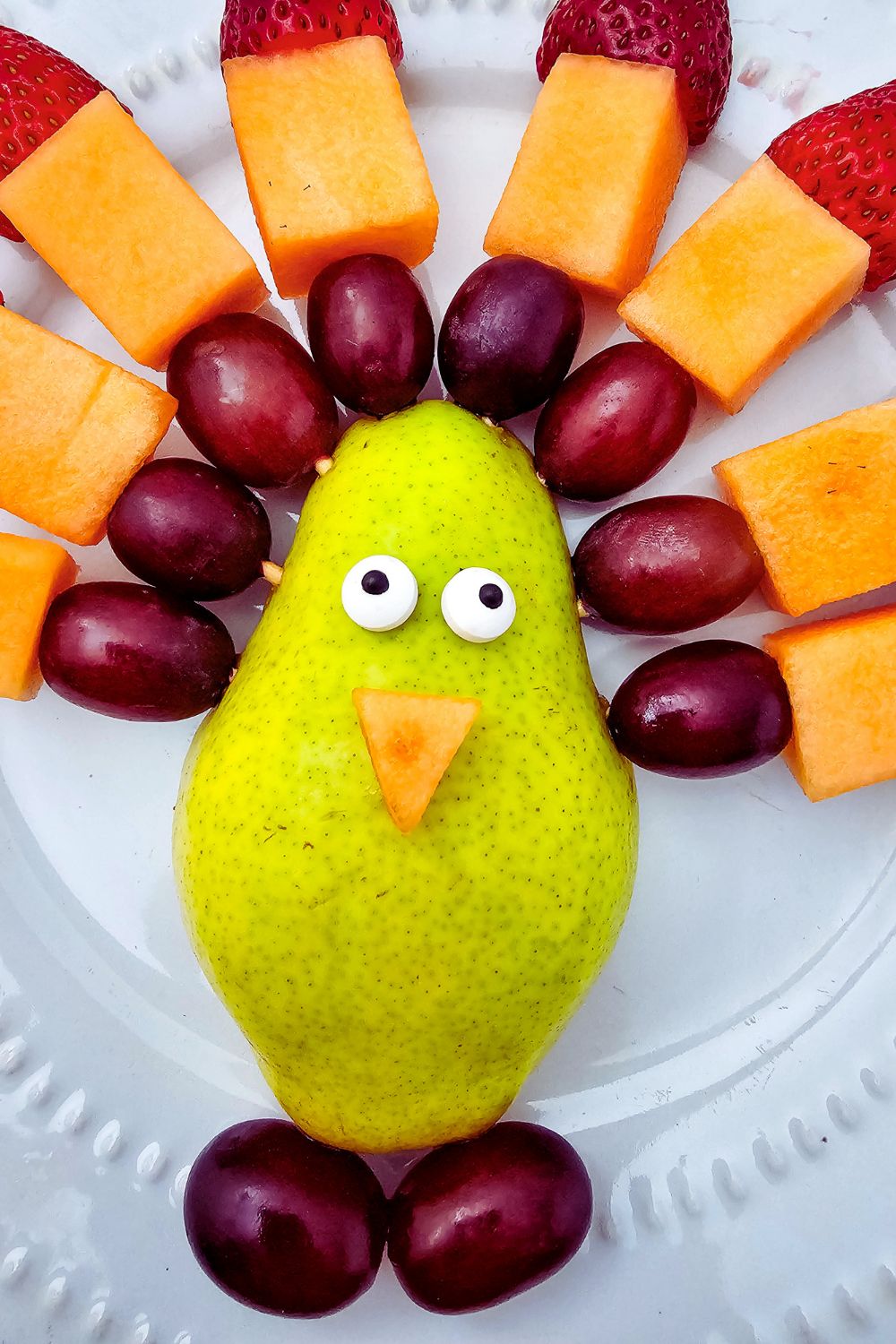 Slice the pear in half lengthwise - this will be your turkey’s adorable little body. Cube the cantaloupe, halve the strawberries, and carve out a teensy cantaloupe triangle for the nose.