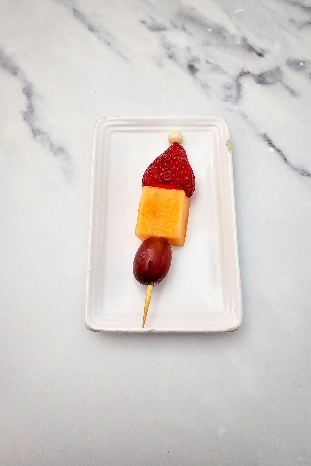 - Arrange the fruit on skewers - strawberry half, cantaloupe, grape