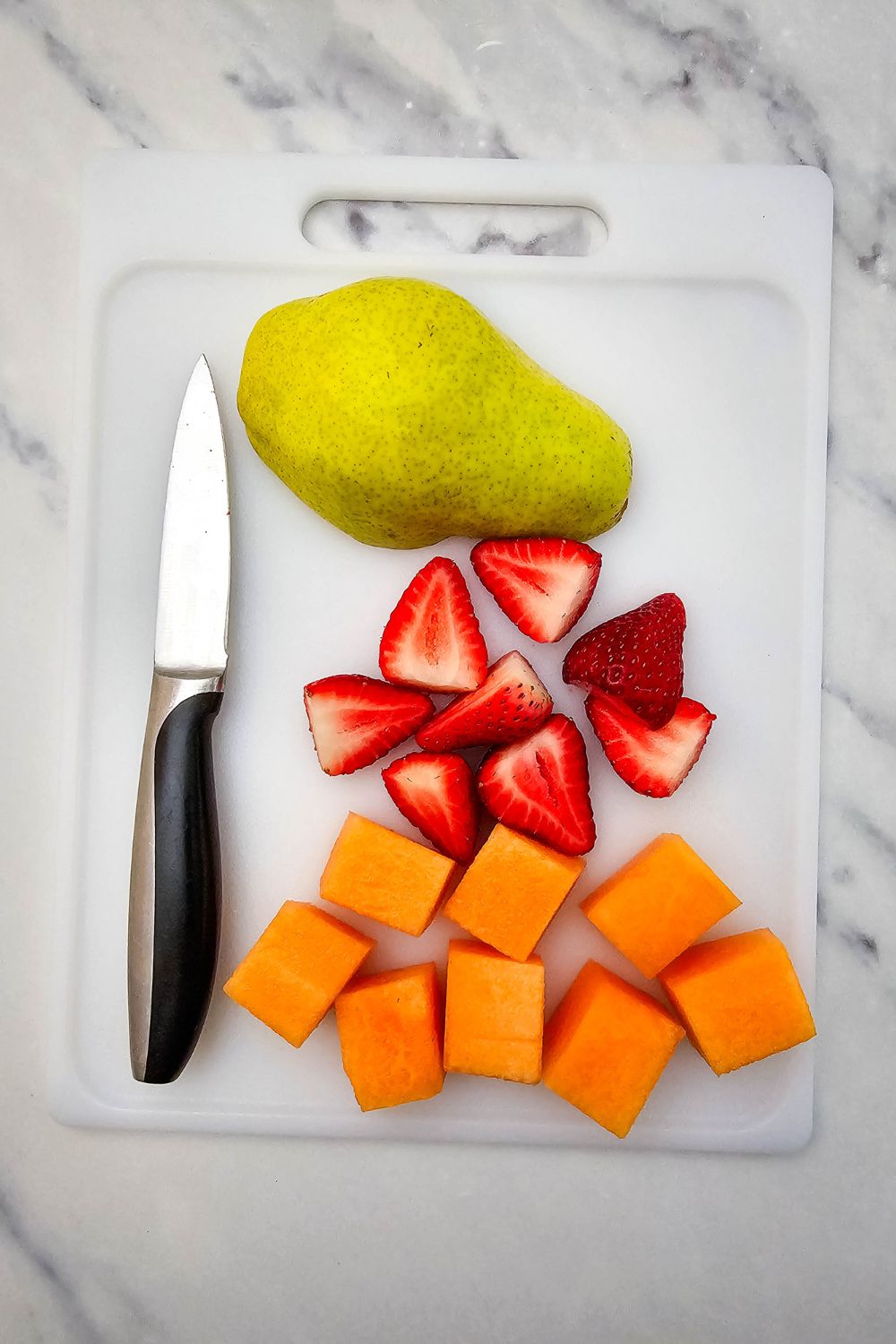 - Cut the fruit. Slice the pear in half lengthwise to use for the body. Cut the cantaloupe into 1 inch cubes. Slice the strawberries in half. You will need to cut a very small triangle out of the cantaloup for the nose as well.