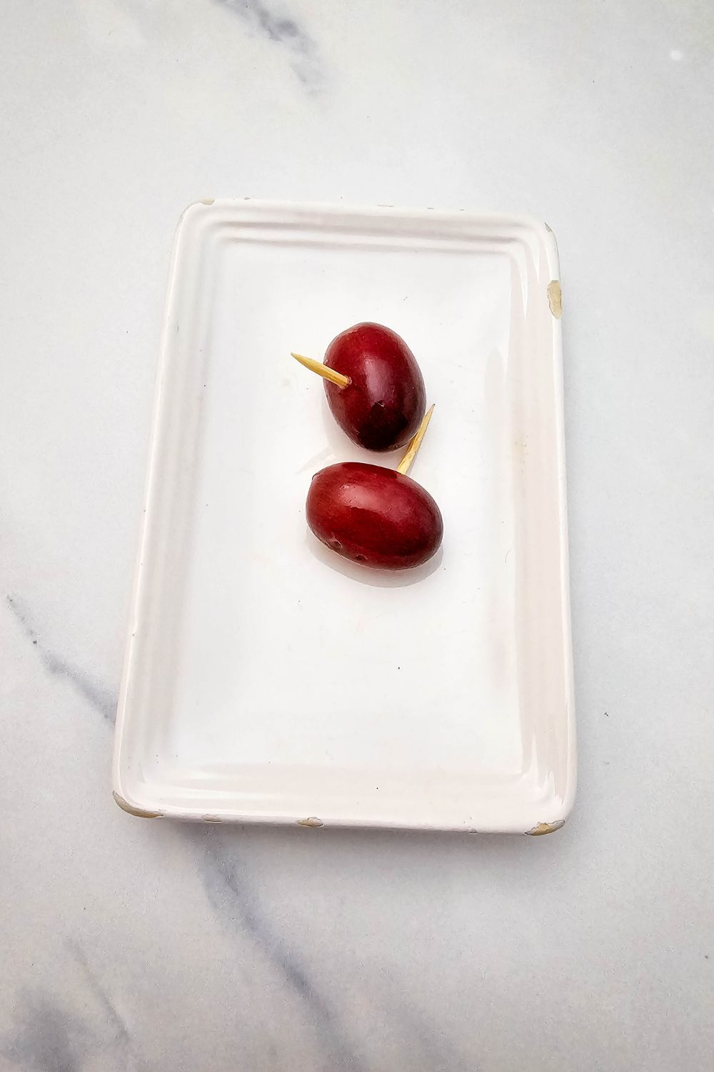 - Poke a half toothpick each into 2 of the grapes. Poke those through the bottom of the pear for the “feet”.