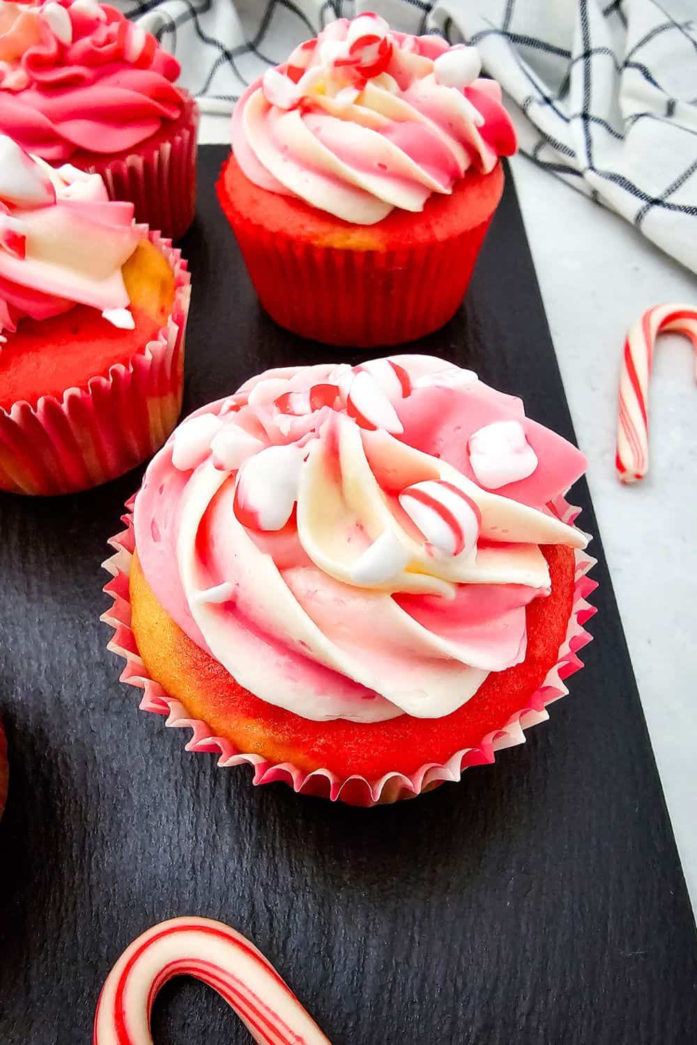 Aa festive holiday dessert with fluffy vanilla cake swirled with red for a peppermint-inspired look. Topped with creamy frosting and crushed candy canes, they’re as pretty as they are delicious.